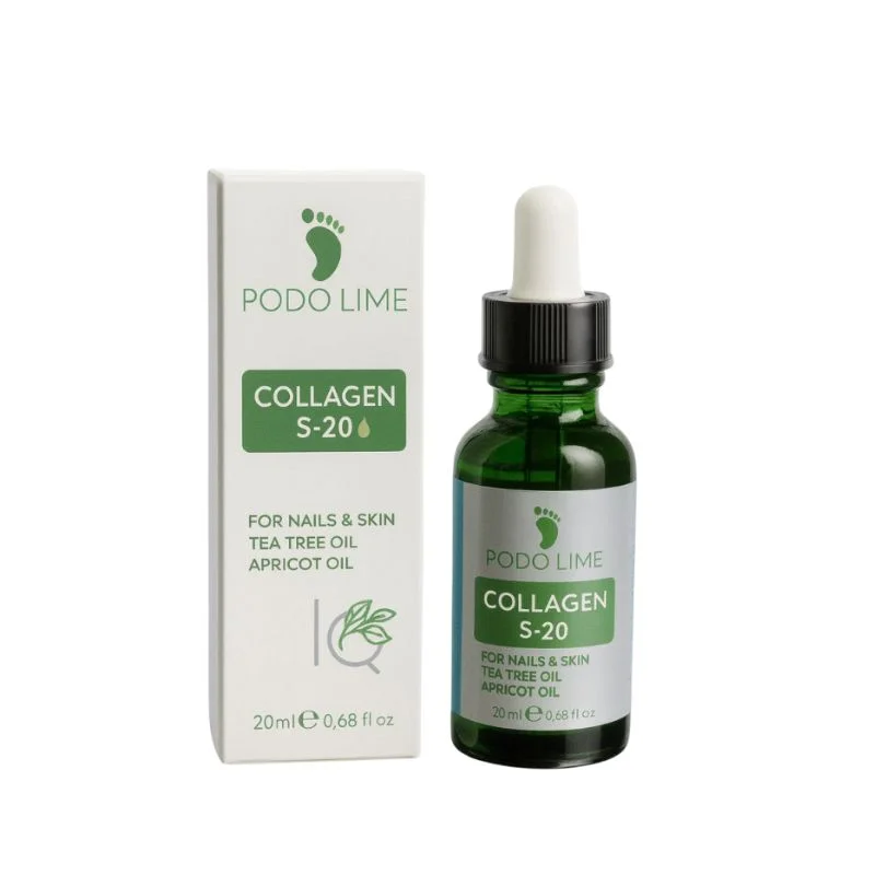 - Podo Lime Collagen S-20 on spetsiaalselt loodud seerum, mis taastab ja niisutab küüneplaati ning küüneümbruse nahka. Uuendatud koostis (2025) tagab veelgi sügavama imendumise ja tõhusa niisutuse, aidates taastada küüneplaadi kaitsefunktsiooni ja toetades küünte kasvu.